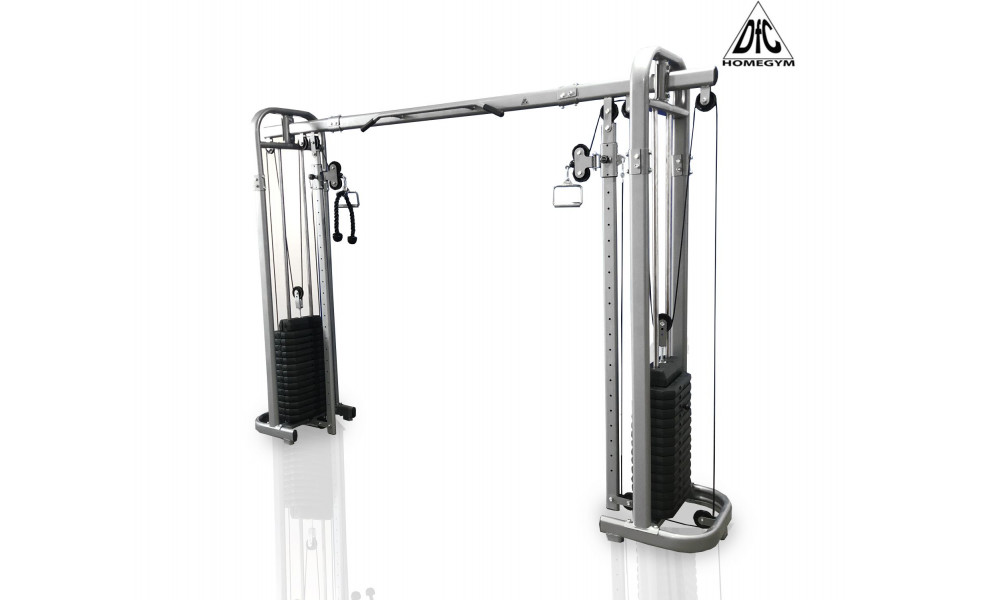 Силовая рама DFC D1009 со встроенным весом предназначена для домашнего использования, позволяет прокачивать все мышцы тела благодаря возможности регулировки. На кроссовере можно выполнять тягу руками (в разных положениях), приседания с весом и махи, упражнения на укрепление мышц кора, подтягивания. Турник с нескользящими ручками, входящий в комплектацию, выдерживает вес до 100 кг. Положение рук широким хватом хорошо укрепляет спину, руки и плечевой пояс. Кроссовер оснащён двумя тягами — металлическими ручками с нескользящим хватом. Ручки регулируются по высоте в 21 положении: можно выполнять упражнения на разные группы мышц и варьировать угол тяги. В комплектацию входит канат для упражнений на трицепс и бицепс (сгибания, разгибания рук), мышцы плеч и кора (упражнение "священник"). Канат крепится к регулируемой по высоте каретке. Силовые стеки весом по 75 кг входят в комплектацию. Вес пластин — 4 и 5 килограмм. Общая нагрузка регулируется при помощи фиксатора одним движением руки. Плавность хода стеков гарантируют ролики на подшипниках. Основа всей конструкции — рама из трубы размерами 40 х 80 х 1,5 мм.