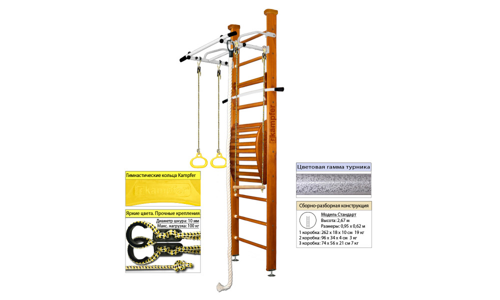 Детский спортивный комплекс ДСК Kampfer Helena Maxi Ceiling это дополненная версия одной из самых популярных моделей из линейки деревянных ДСК Kampfer. Распорная шведская стенка Helena Maxi теперь в новой цветовой гамме, что позволяет подобрать нужный оттенок под дизайн помещения.